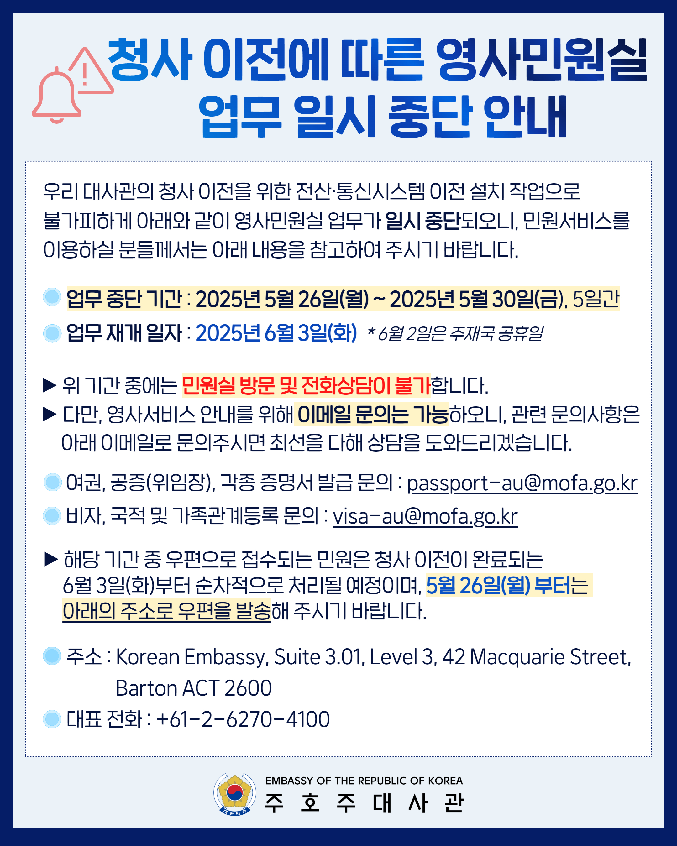 주호주 대한민국 대사관이 청사 이전을 진행함에 따라, 전산·통신 시스템 이전 설치 작업으로 인해 영사민원실 업무가 일시 중단됩니다. 민원 서비스를 이용하실 분들께서는 아래 내용을 꼭 확인해 주세요.