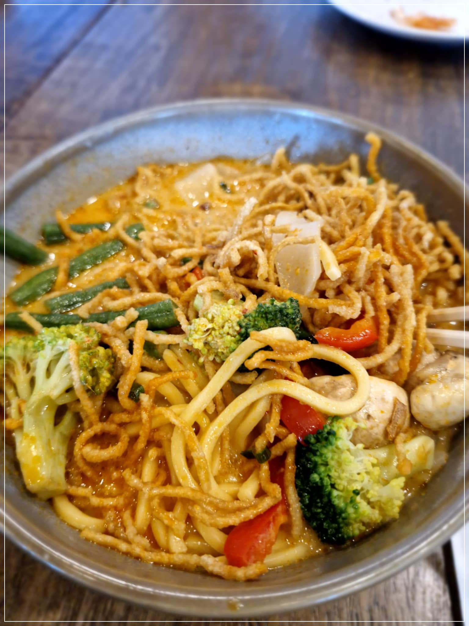 코코넛 밀크 기반의 매콤한 국물에, 중화면과 바삭한 튀김면이 함께 들어가 있는 태국식 라면.