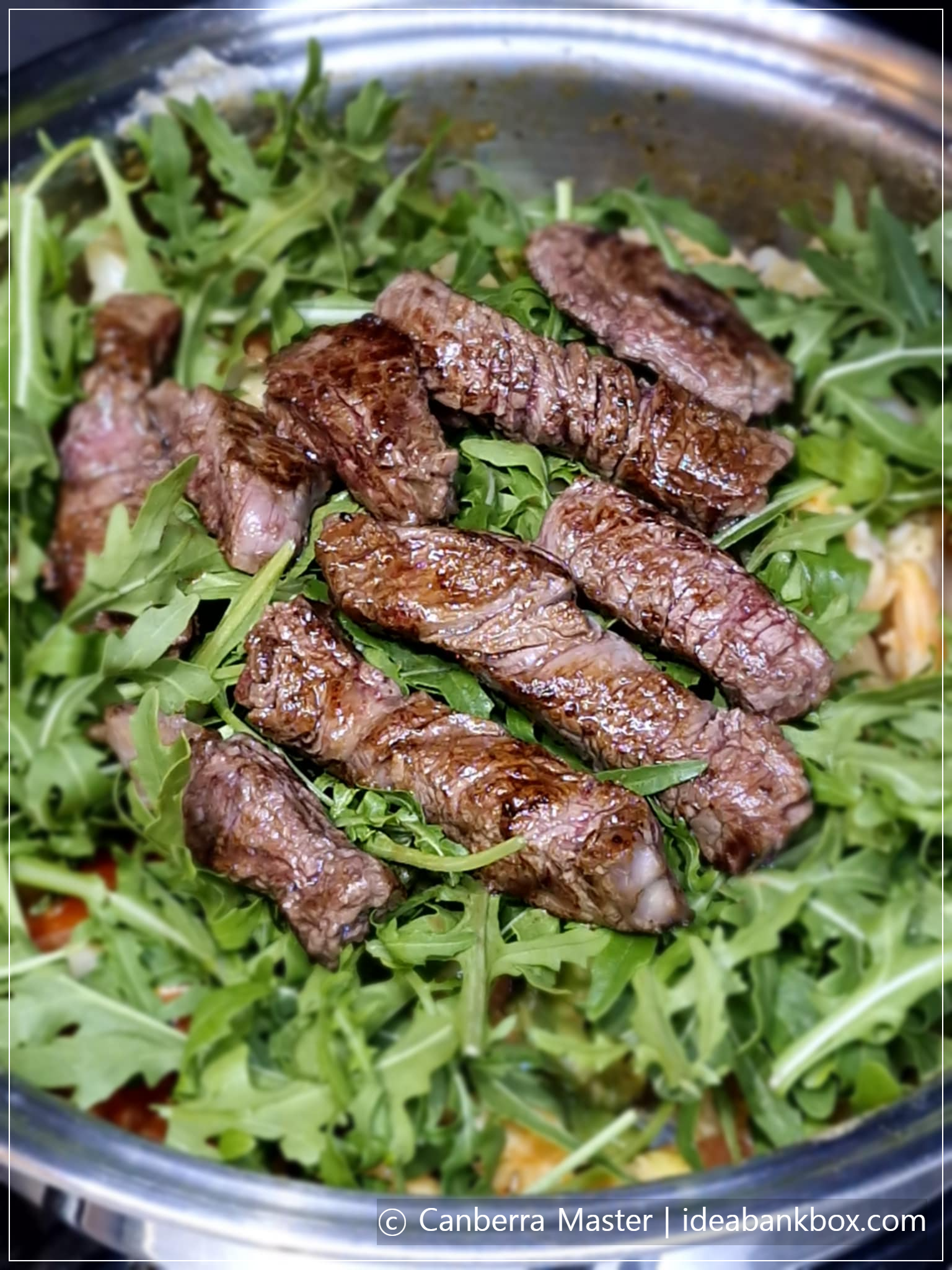 볶음 위에 생 루콜라를 듬뿍 올리고, 잘라둔 립아이를 예쁘게 얹어 마무리!